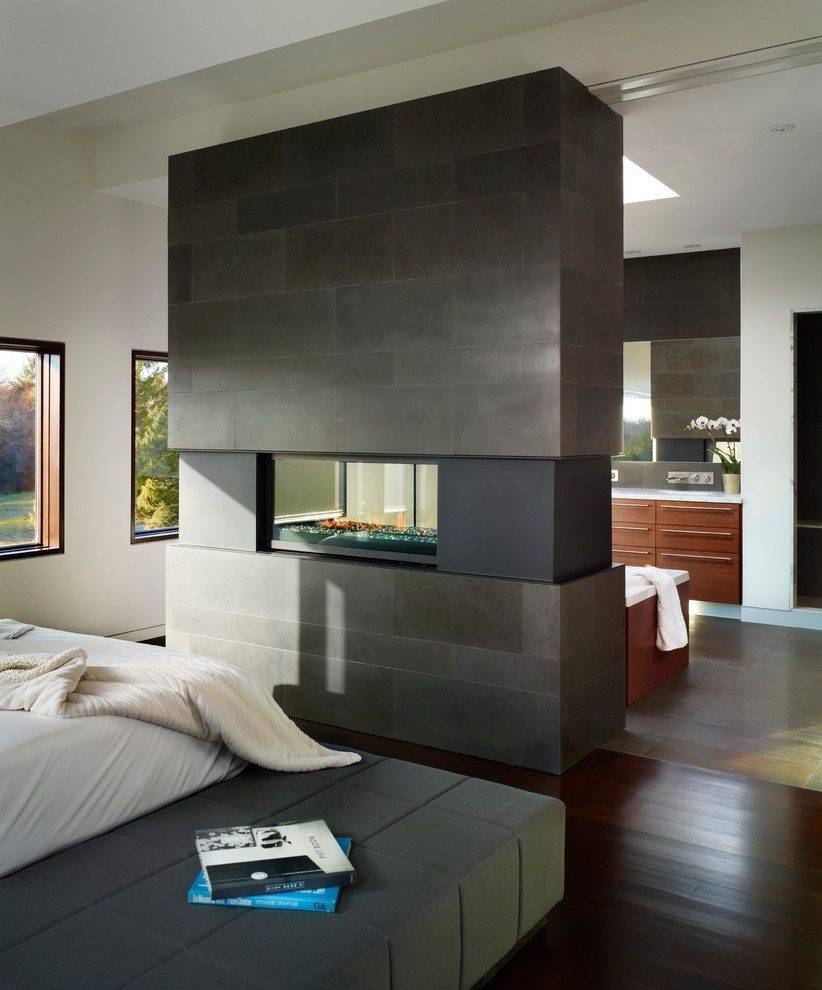 Просторное помещение часто нуждается в разделении на зоны. Кухню от комнаты удобно отгородить столом или барной стойкой. Для того, чтобы скрыть кровать в гостиной, возводятся стеклянные или реечные перегородки, ставятся ширмы, вешаются шторы