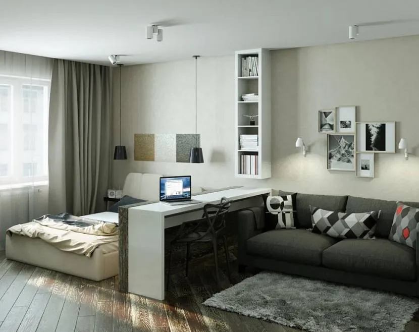 - Спальня-гостиная. Это пространство для молодой семьи, где кроме ТВ, рабочего стола и хорошего дивана ничего особенного не требуется. Пример интерьера такой гостиной – на фото