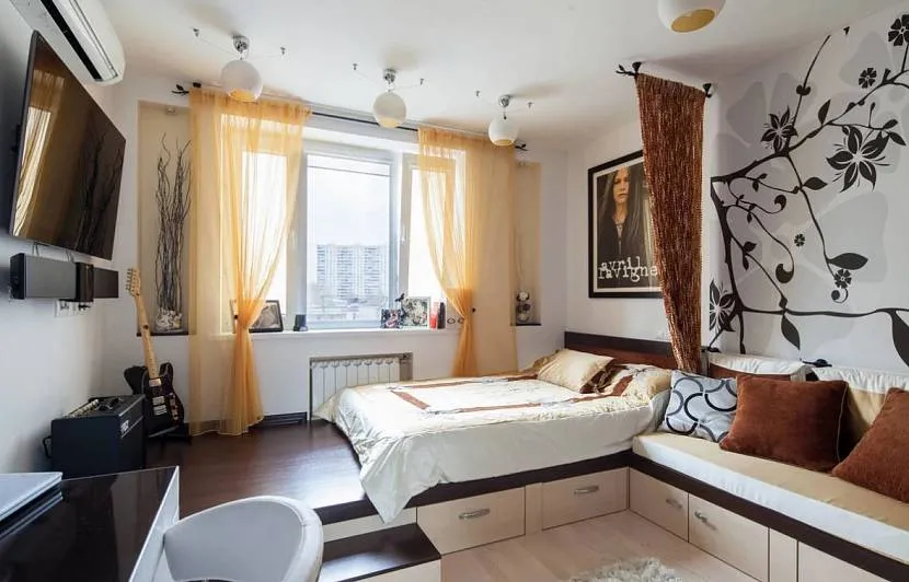 Гостиная с кроватью-подиумом в центреИсточник topdizz.com
