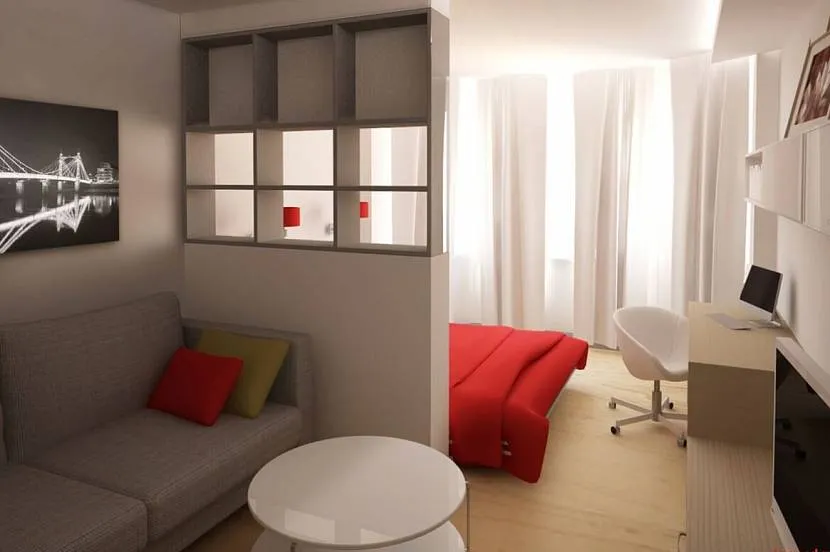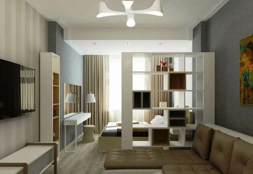 Деление на зоны небольшой комнаты выполняют только прозрачными и легкими конструкциями. Подойдут легкие занавеси, открытые стеллажи, ширмы. Самый простой вариант – зонировать помещение цветовыми оттенками и световыми приборами.