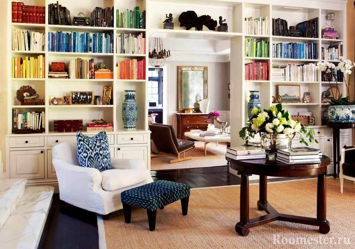 - Стеллажи открытого типа, со стеклянными дверцами не «перегрузят» гостиную, визуально сделают свободной, воздушной.