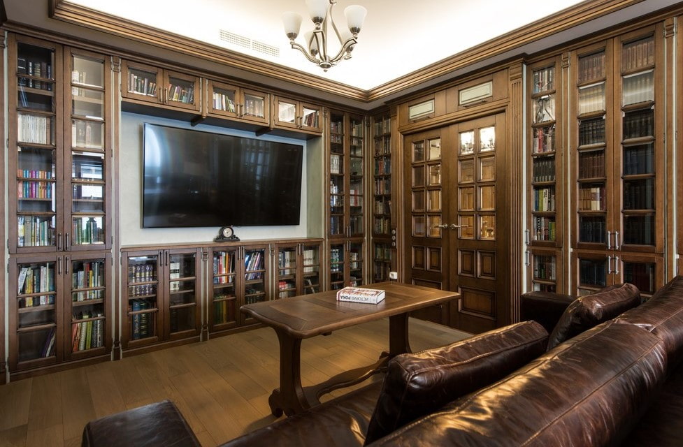 ТВ-экран, встроенный в мебель. Разработчики модульной мебели чаще всего предусматривают место под телевизор. Популярный вариант размещения – когда для монитора ТВ отводится центральное место, по середине прямоугольника, который образуется высокими боковыми шкафами, нижней тумбой и верхней полкой. Особенно благородно выглядит вариант с мебелью темных оттенков – тогда телевизор будто сливается с мебелью, за счет этого пространство становится более целостным, монолитным;