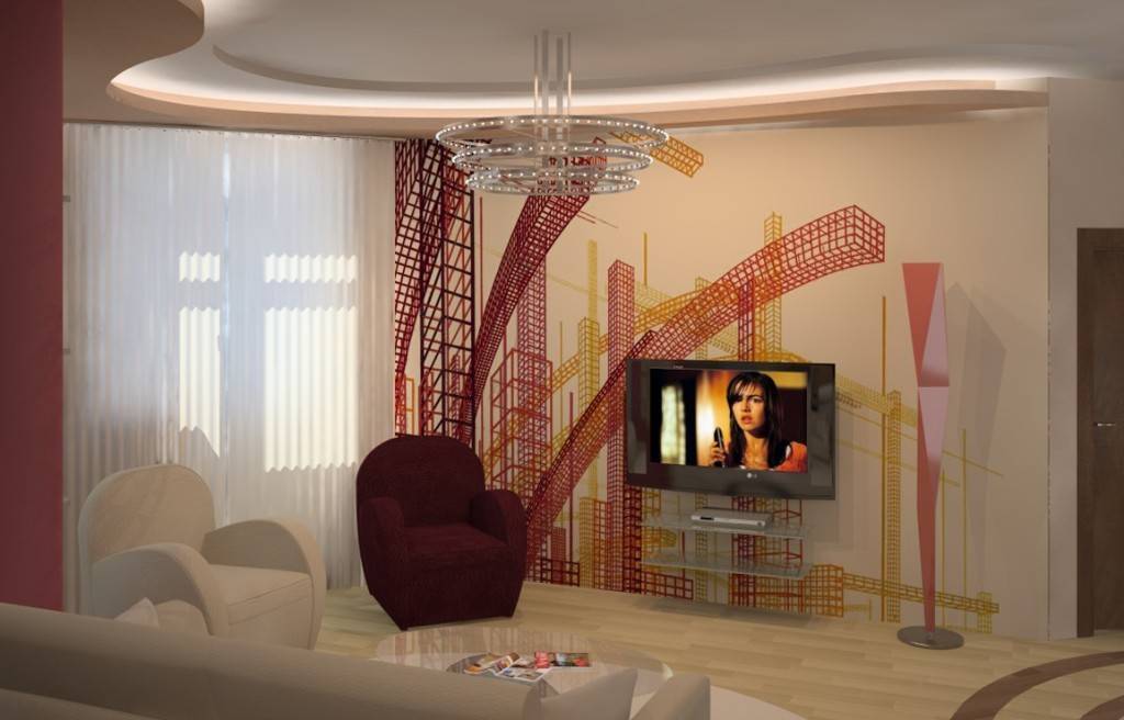 В гостиной, как известно, самое «зримое» место — это зона телевизора. Благодаря тому, что современные телевизоры имеют тонкую конструкцию, стало возможным их монтировать на стену; в итоге получается очень стильно и практично. А для того, чтобы добавить еще стильности, стали изготавливать ниши и короба из гипсокартона для места на стене под телевизор и другой аппаратуры.