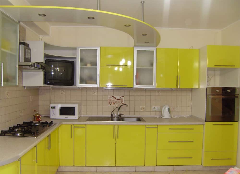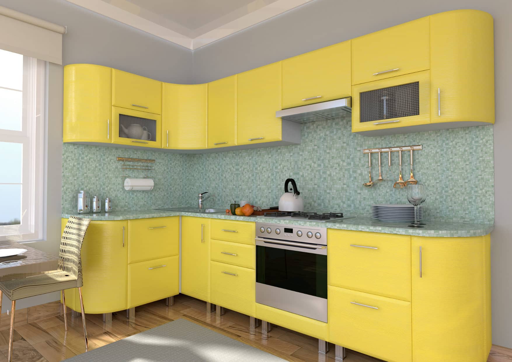 К желтому гарнитуру надо подобрать обои пастельные, белые или разные оттенки зеленого. Серый или соломенный цвет обоев как нельзя лучше подойдет к синему гарнитуру.