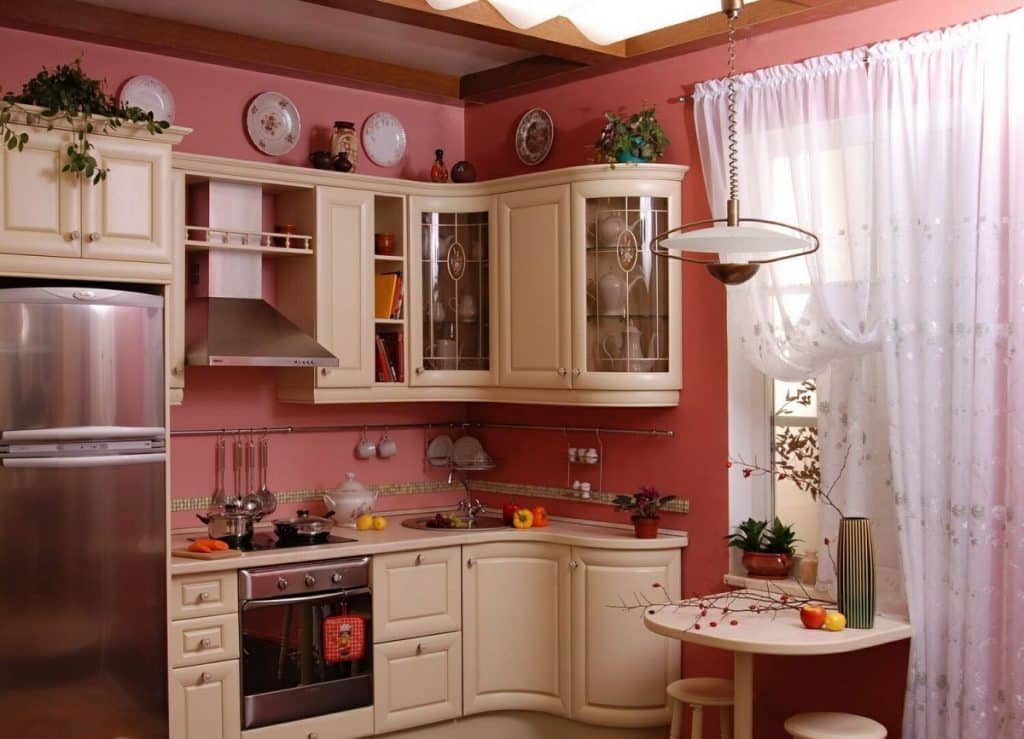 Если вам нравится красный цвет, то можно использовать вишневые или коралловые оттенки. Насыщенный же ярко-красный будет со временем раздражать. Хороши для южной кухни насыщенный синий и голубой цвета. Считается, что хорошо влияют на пищеварение фисташковый и мятный цвета. Универсален для всех вариантов белый цвет.