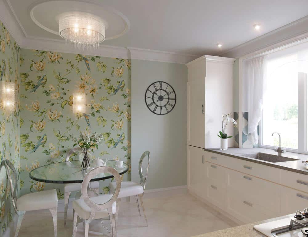 Это помещение считается самым посещаемым и важным в доме. Помещение несет большую функциональную нагрузку. Здесь готовят пищу, ужинают всей семьей, собираются за чашкой чая в дружеской компании. Поэтому здесь обои должны выдерживать особую нагрузку, а интерьер должен быть жизнеутверждающим и функциональным. Здесь можно комбинировать покрытия ярких расцветок с фактурными и крупными рисунками для выделения определенных зон с нейтральными.