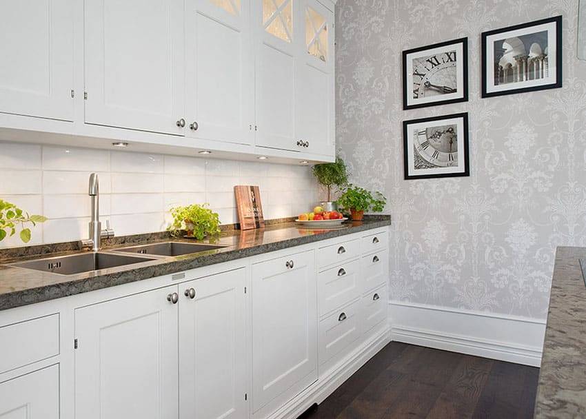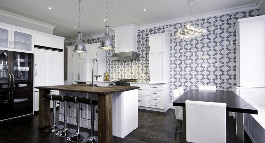 Для белого гарнитура надо выбрать белые обои с графическим рисунком, полосками или фотообои.