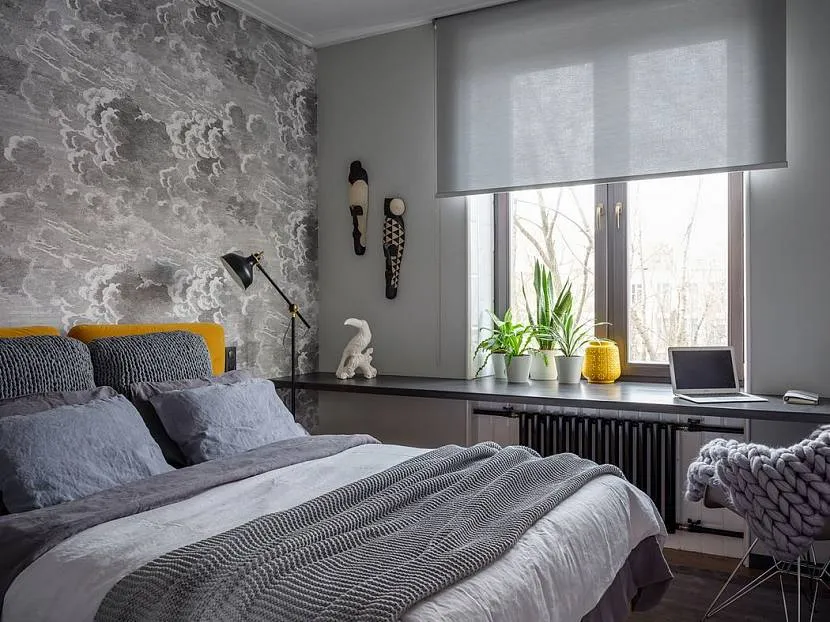 Для спальни особое внимание следует уделить кровати. Она должна быть удобной, с большим изголовьем, обитым приятным текстилем или кожей. Если площадь квартиры небольшая, можно обратить внимание на трансформеры