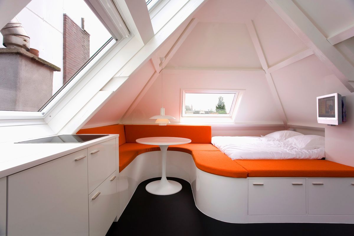 Скруглённые углы мебели в маленькой квартире-студии на мансарде