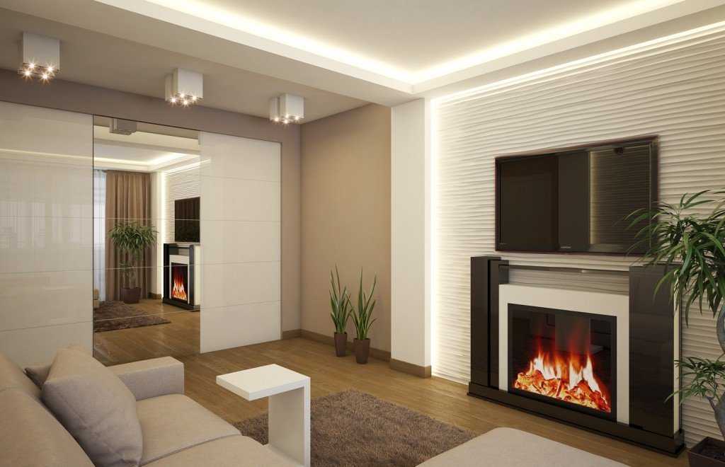 - В маленьком зале не следует использовать слишком большие каминные конструкции и габаритные плазмы. Лучшим решением станет расположение компактных устройств на одной стене или в углу.