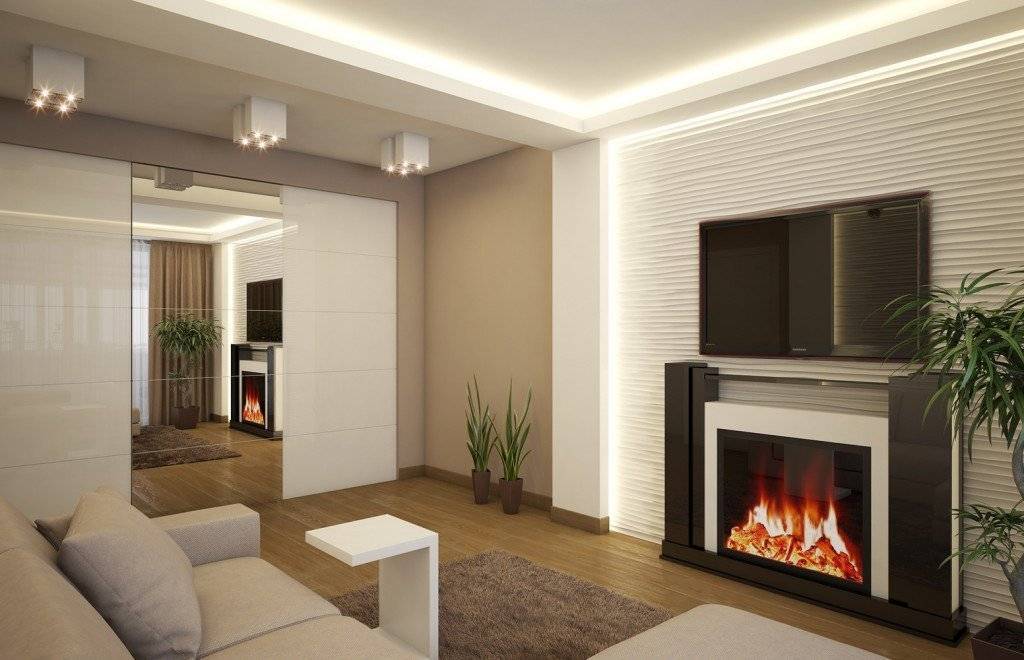 Даже в относительно небольшой гостиной комнате можно встроить современный камин. Электрический камин в интерьере небольшой гостиной сделает ее еще уютнее, придав при этом роскоши и шика даже самому простому помещению.Основных вариантов дизайна два. Первый вариант, который больше подойдет для современных интерьеров и маленьких комнат – лаконичный минимализм. Камин встраивается в ту же стену, на которой располагается телевизор, обычно – точно под ним