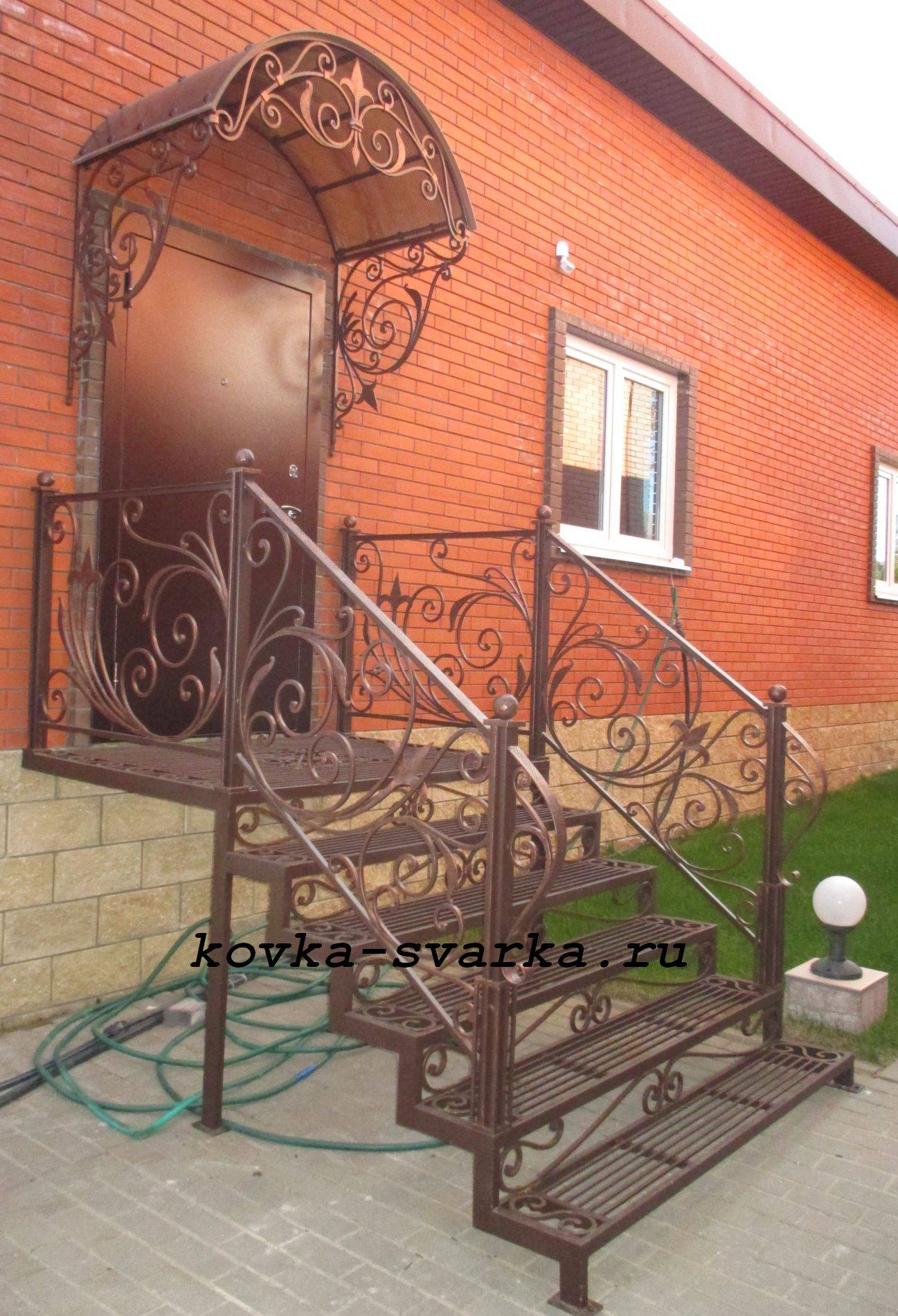 Козырек над крыльцом лучше сделать высоким, а саму лестницу широкой, и не очень крутой. Всегда уместны красивые перила с элементами из кованого металла, стиль которых должен повторяться в декоративной отделке ворот.