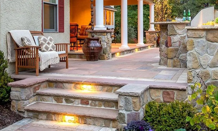 При наличии высокого фундамента у сооружения необходимо оформить крыльцо, используя ступеньки. В результате терраса с зоной отдыха будет находиться на определенном возвышении, если сравнивать с уровнем земли. Оформляйте ступеньки и покрытие пола камнем или бетоном, деревом с пропиткой или кирпичом, чтобы обеспечить защиту от воздействия влажности или насекомых.