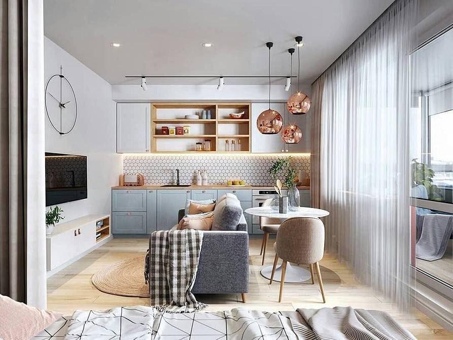 После того, как вы определитесь с расстановкой мебели в пространстве, продумайте, какие приемы помогут сэкономить место или хотя бы сделать такой интерьер более легким для восприятия.
