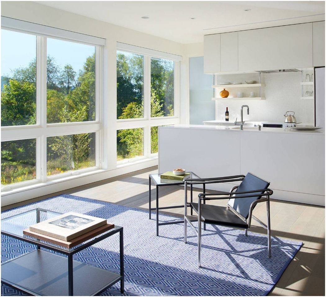 Организация гостиной во многом зависит от количества и расположения окон. Как правило, зона отдыха располагается поближе к источникам естественного света. Только если в помещении находиться два окна рядом, кухня может «занять» одно из них.