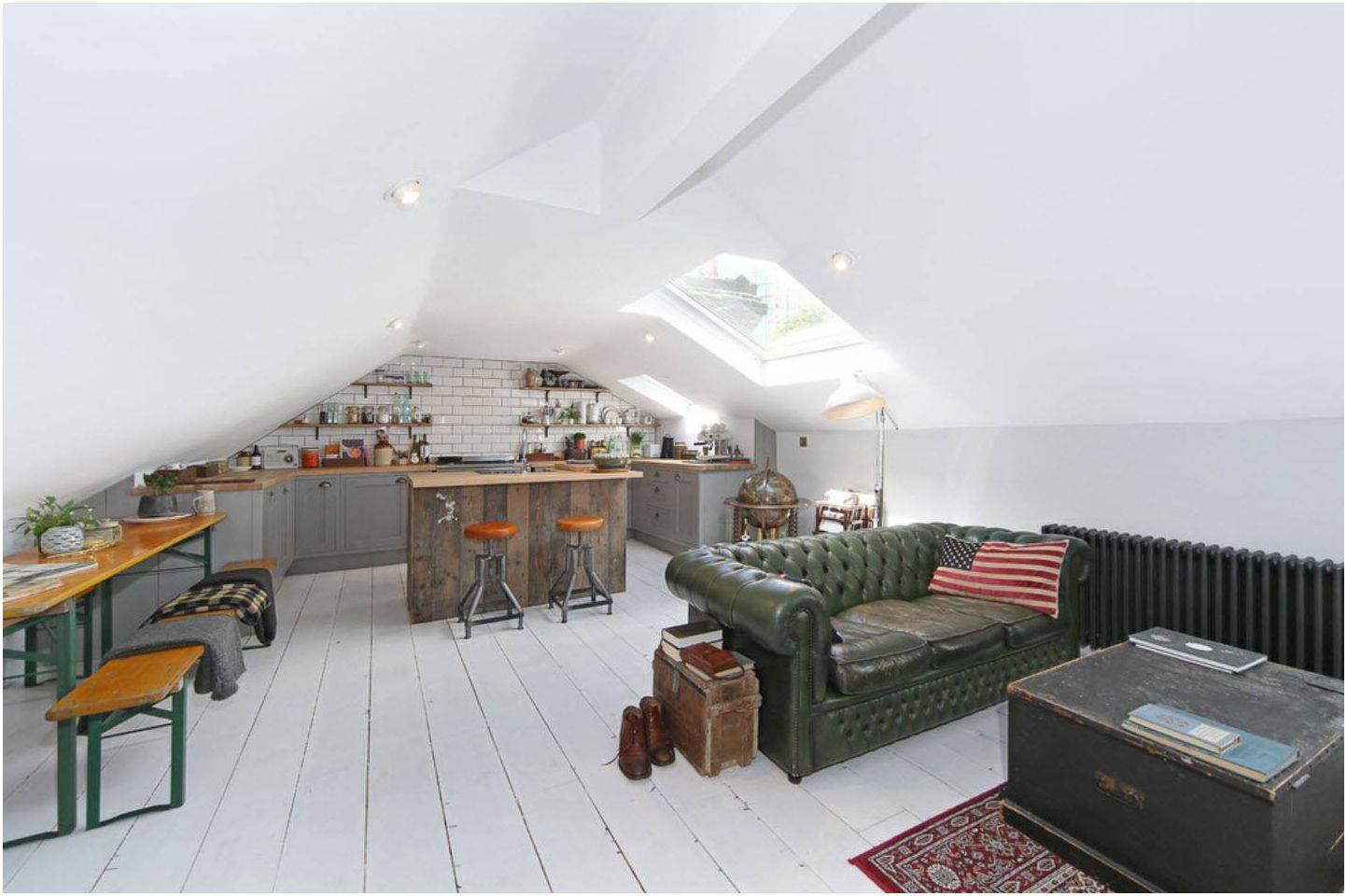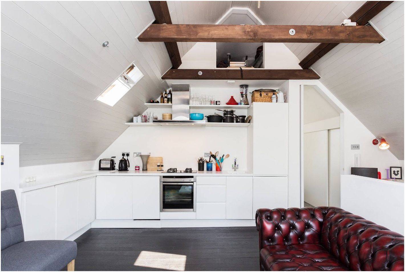 Тем, кто готовит мало, будет достаточно небольшой рабочей поверхности, поэтому такая кухня может занимать небольшую стену или угол довольно просторной комнаты. Это не исключает использование острова, барной стойки и небольшой обеденной группы. Небольшая площадь кухонной зоны позволяет существенно увеличить гостиную.