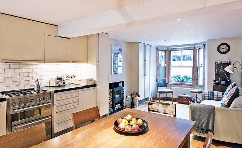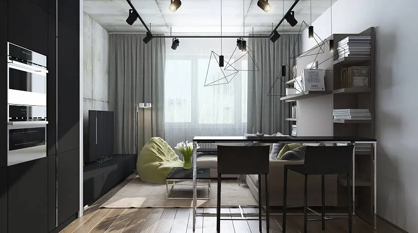 Компактная кухня — гостиная исключает лишние детали для зонирования