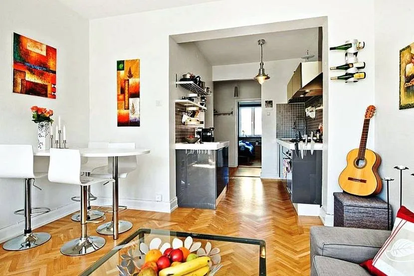 Перегородки или раздвижные конструкции станут настоящим украшением интерьера. Они могут быть прозрачными или матовыми, изготовленными из стекла или гипсокартона. Оснащенные роликовыми механизмами, такие конструкции при желании задвигаются, не занимая при этом много места. Отгородить кухню от гостиной можно обычным диваном или софой. Отдавайте предпочтение многофункциональной раскладной мебели, чтобы было дополнительное пространство для хранения вещей, а также спальное место для гостей