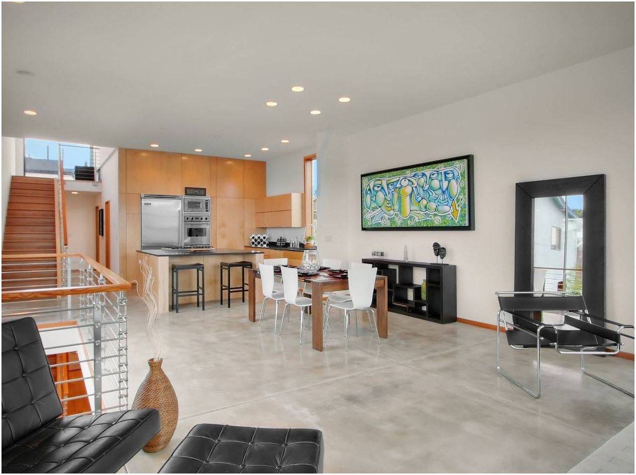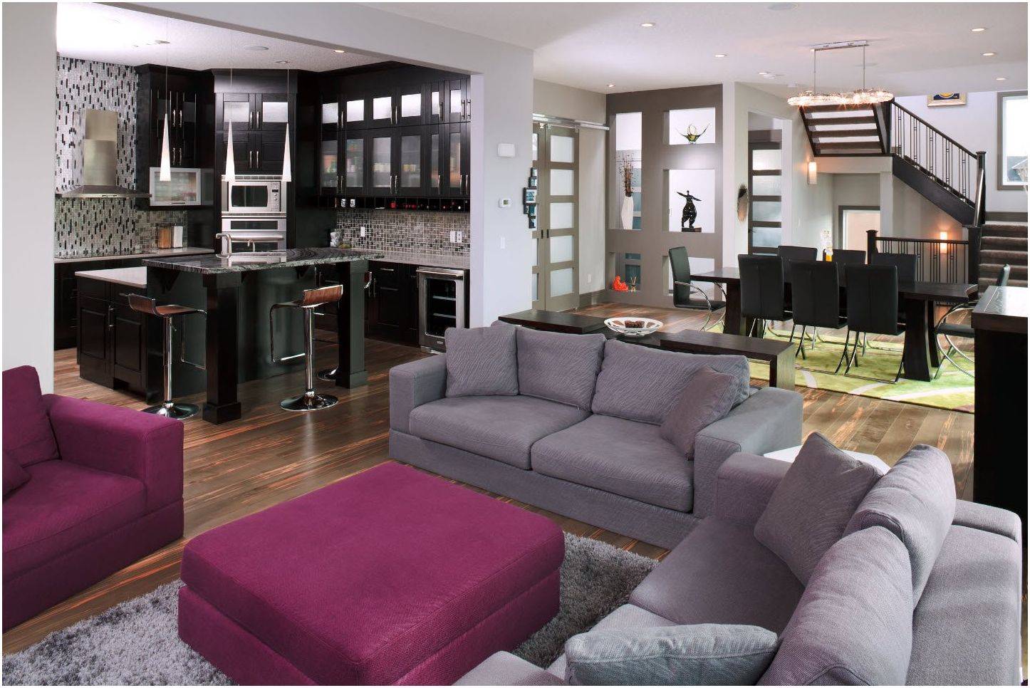 Мебель. Зонировать можно при помощи мебели, устанавливая ее на границе зон. Если поставить обеденный стол со стульями между кухней и гостиной, получится гармоничное пространство с зонами, плавно перетекающими друг в друга. Кухню удобно отделять барной стойкой, которая сама по себе является многофункциональным предметом с большими дизайнерскими возможностями. Гостиную часто отделяют большим диваном; для этого его разворачивают спиной к рабочей зоне.
