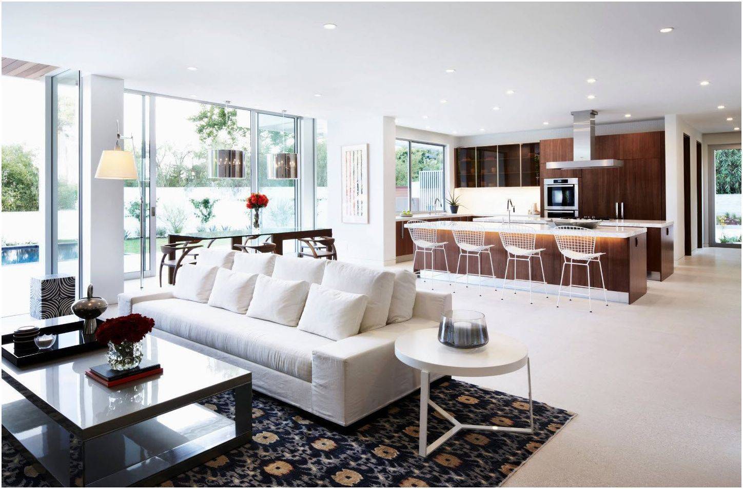Идея открытой кухни вовсе не необычна, особенно в случае современных домов. В настоящее время тенденция состоит в том, чтобы сделать интерьер максимально свободным и упростить структуру и декор, не жертвуя функциональностью. Именно поэтому устранение барьера между кухней и гостиной является практичным шагом. Чаще всего кухня связана с обеденной зоной и смежной гостиной. Обеденный стол обычно становится буферной территорией между участками комнаты.