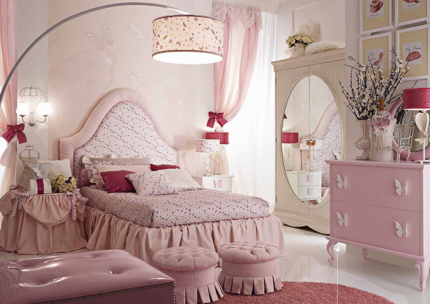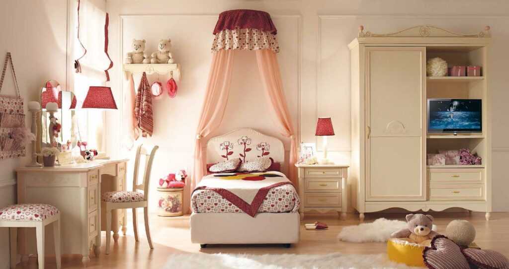 Здесь придется довольствоваться малым — кровать или диван, зеркало с туалетным столиком, шкаф-купе, навесные полки, прикроватные тумбочки с лампами. Если нужно уместить двух или больше детей, подберите удобные двухэтажные или угловые кровати с нишами под вещи, диван. Экономят место откидные столики или столешницы, объединенное с подоконником.