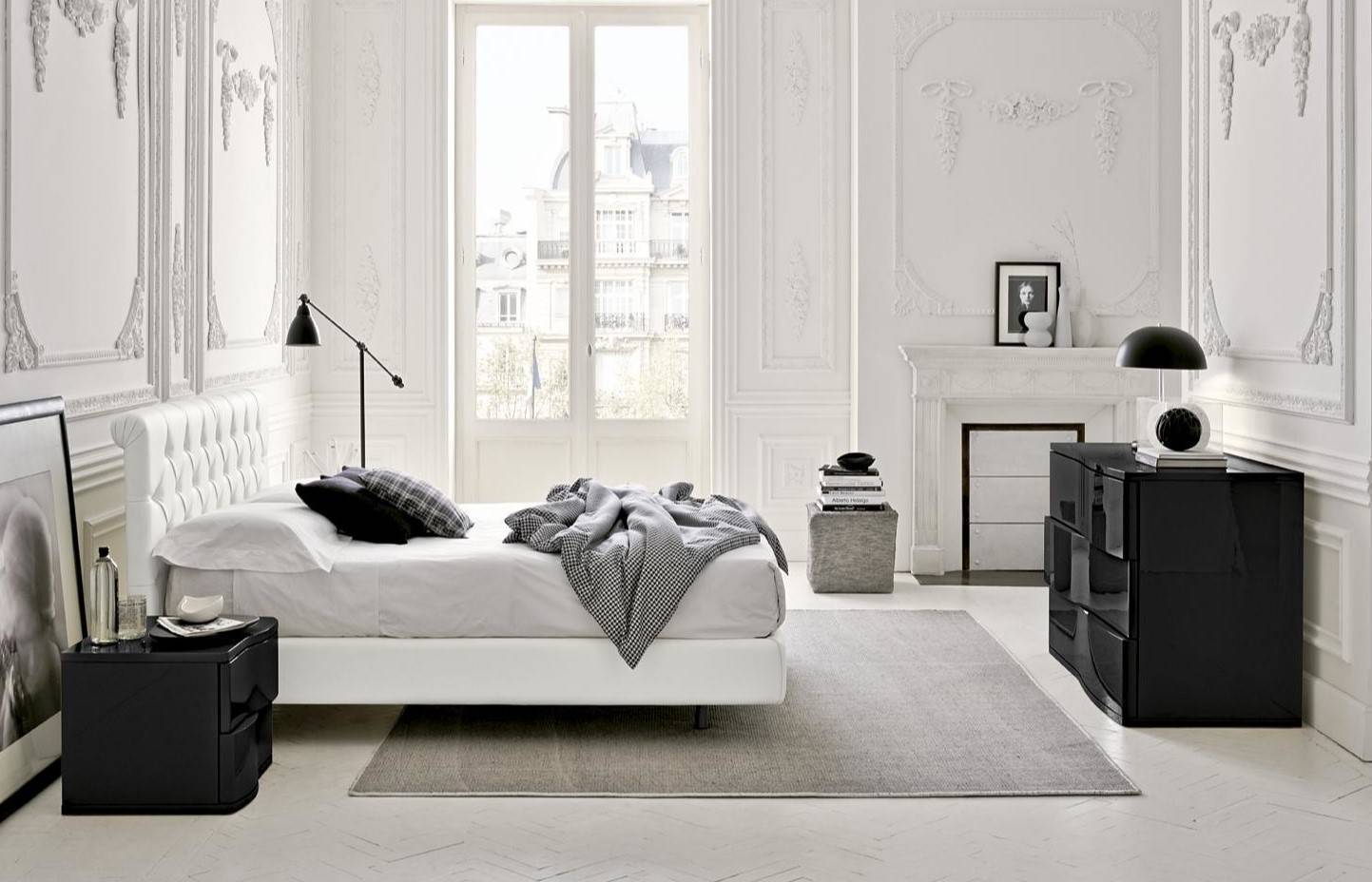 Дополнения выглядят прикроватными тумбами, туалетным столиком, лаконичным комодом. Приглушённое освещение представлено настольными лампами, бра.