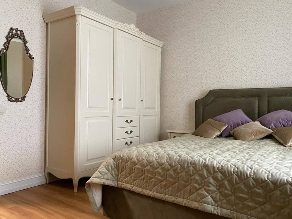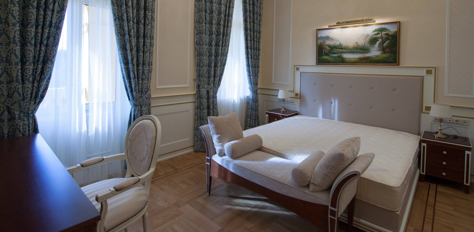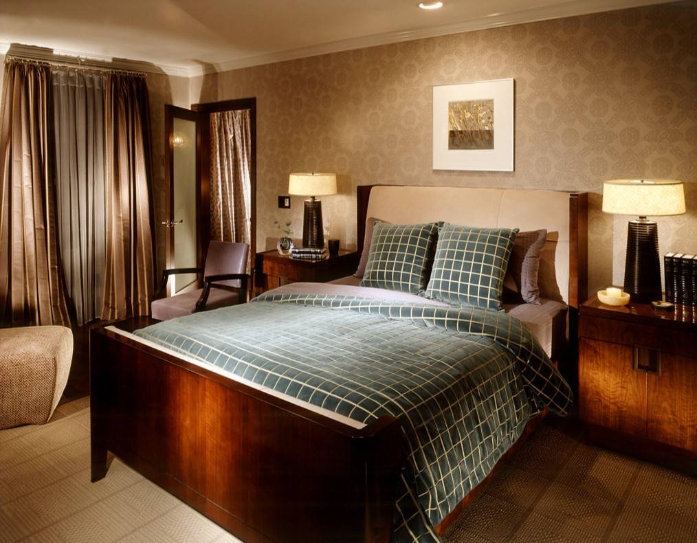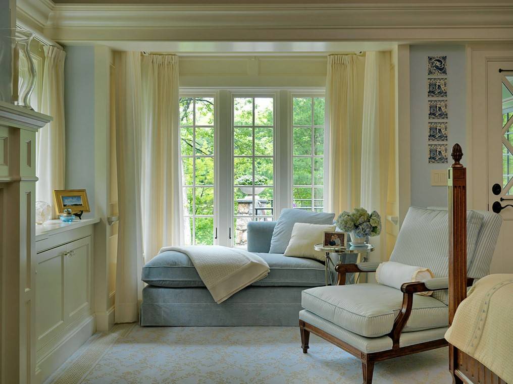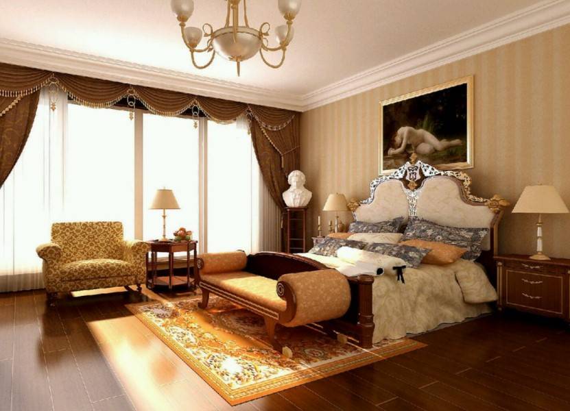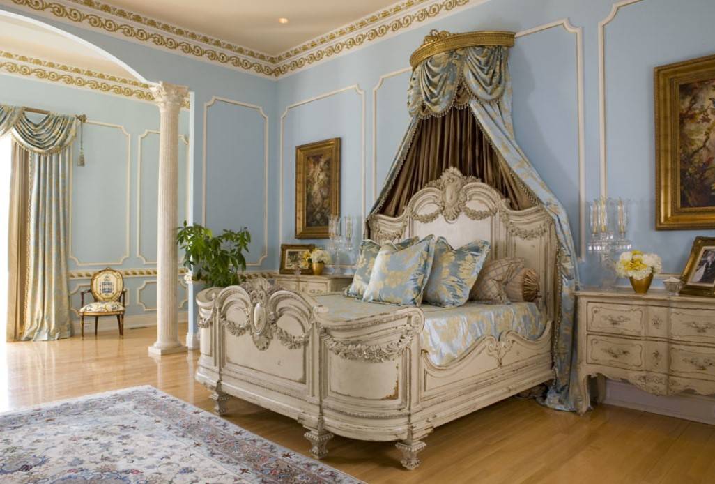 Классический интерьер спальни включает по центру огромную кровать, имеющую резное изголовье, возможен высокий балдахин. Белоснежную шёлковую постель прикрывает одеяло, соответствующее по цвету шторам.