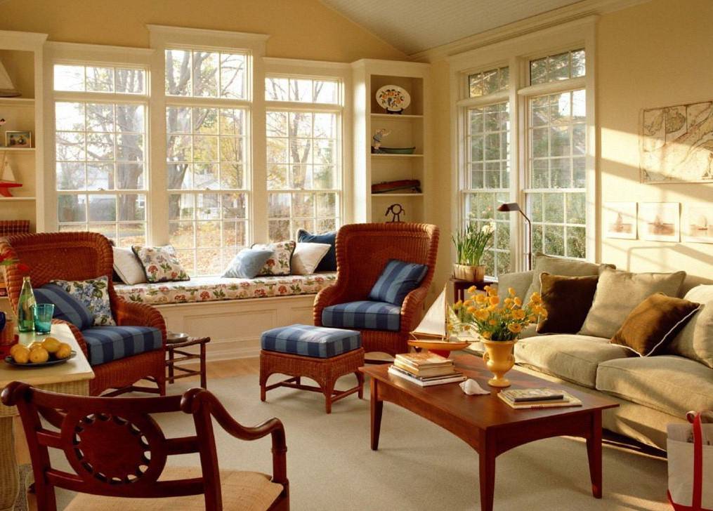 Мебель должна иметь яркую обивку – белую, синюю, желтую, красную, зеленую. При этом стены обязательно должны иметь светлые тона – голубой, розовый, белый, бежевый, светло-серый. Остальной текстиль в доме имеет также сдержанные формы и должен нести в себе монотонность.