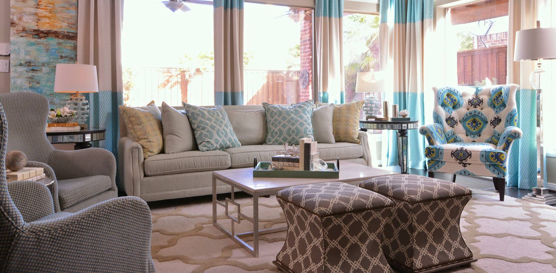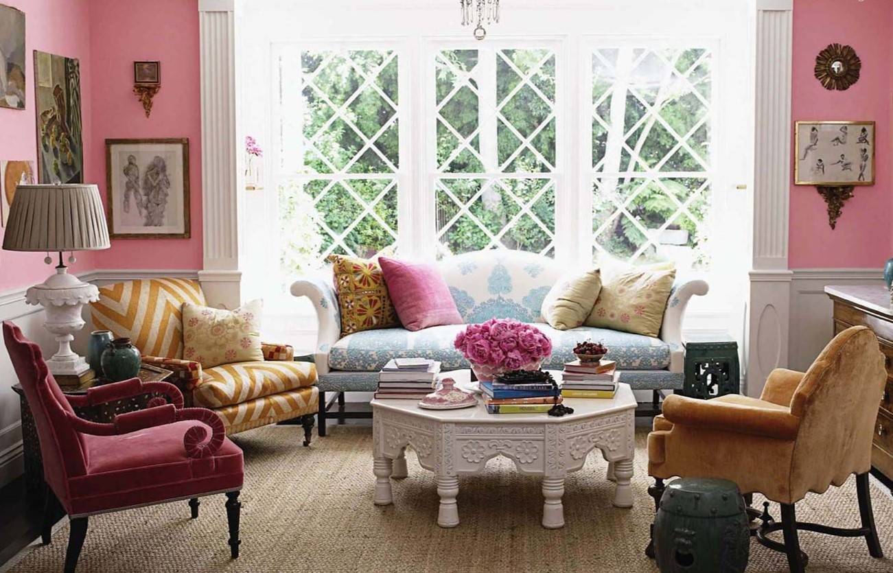 Модное сочетание розовых и голубых оттенков в интерьере гостиной