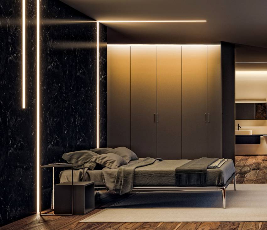 При выборе освещения стоит обратить внимание на точечные светильники или споты. Для атмосферности, следует выбирать темные лампы, с рассеянным светом, создавая «парящий» эффект