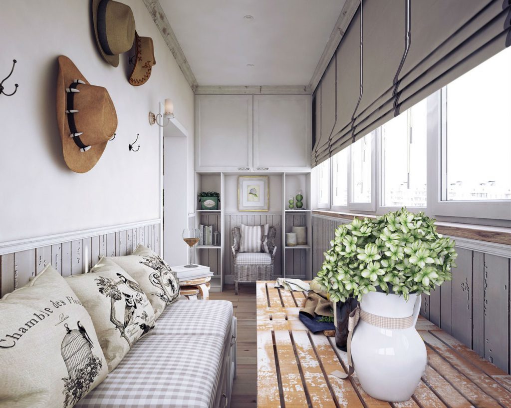 Чаще всего для потолка и стен выбирается один и тот же материал – это поможет не только сократить расходы, но и создаст основу для грамотного дизайн-проекта интерьера балкона.