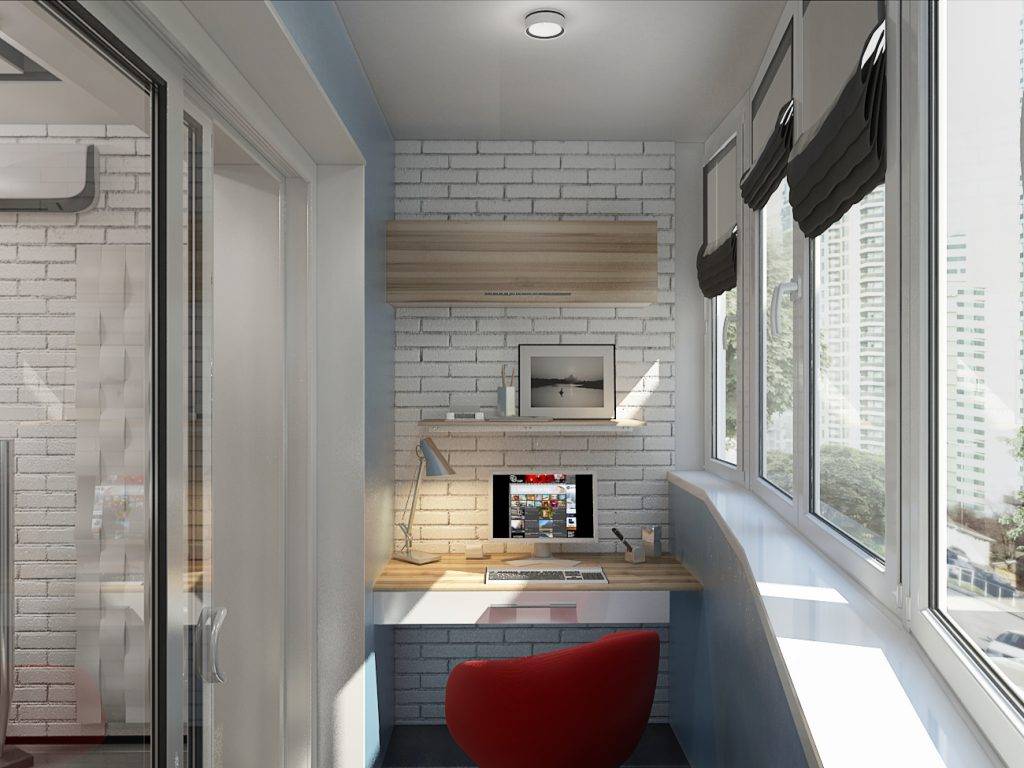Встроенный шкаф на балконе прекрасно вписывается в интерьер и занимает мало места. На ограниченных пространствах рабочий стол можно заменить компактной квадратной тумбой из дерева.