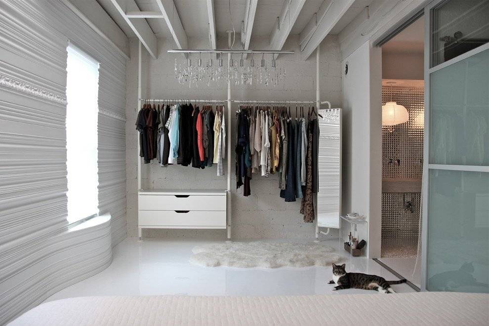 Если ничего подобного в квартире нет, отгораживают часть комнаты — торец или угол — смотреть нужно по планировке. Угловая гардеробная комната хороша тем, что позволяет использовать самые трудно обустраиваемые зоны, именно — углы. Особенно, если в двух смежных стенах есть близко расположенные двери. Эта зона считается «мертвой»: туда кроме небольшой угловой полочки ничего не поставишь: все будет мешать. Примерно такой же вариант — два окна или окно и двери.