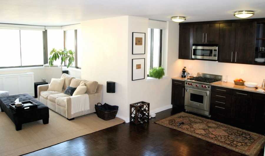 В квартирах-студиях для визуального разделения жилых зон выполняется зонирование. Кухня,