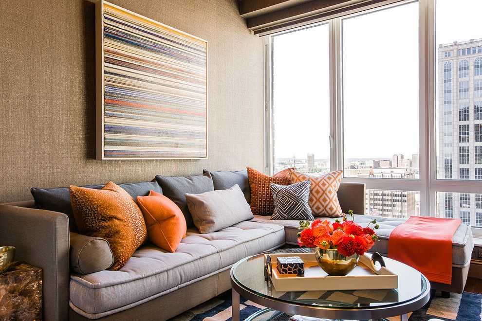 Диван — самый важный элемент интерьера гостиной, на ограниченной площади, идеально, если он модульный, так как дает больше возможностей дизайна. Если вам не нравится модульная конструкция, то можно выбрать классическую раскладную. Оказывается, что модный угловой диван совершенно непригоден для небольшого интерьера, так как может уменьшить еще больше размер помещения. Когда речь заходит о цвете дивана гостиной 12 кв. м, желательно, если он будет насыщенных оттенков: черный, серый, оранжевый.
