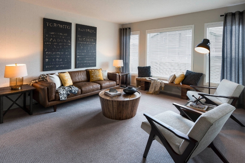 Выберите кресла без подлокотников, чтобы дать дополнительное место без лишнего объема. У вас может не быть места для бокового/торцевого стола из-за большего секционного дивана, но вы можете компенсировать это, поместив большой журнальный столик, с которого каждое сиденье может получить доступ из любой точки зоны.
