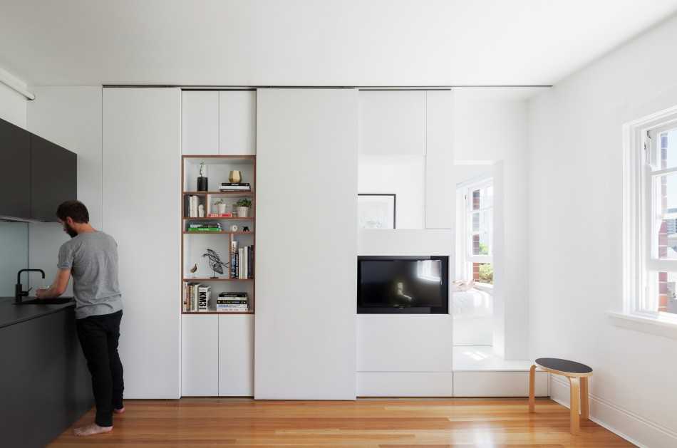 Для полноценного зонирования однокомнатной квартиры используй двусторонние стеллажи или шкафы с раздвижными дверями, по типу купе. Доступ с двух сторон сделает конструкцию практичнее и визуально легче.