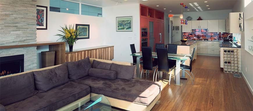 Стоит заметить, что потолок и пол должны быть по уровню одинаковыми. Сочетайте цвета материалов отделки зонирования, при этом пол можно сделать с помощью единого покрытия. Хотя ванную лучше устелить плиткой. Так же плитку можно укладывать и в кухне, а так же в прихожей. При таком решении нужно, чтобы уровень полов был идеальным.