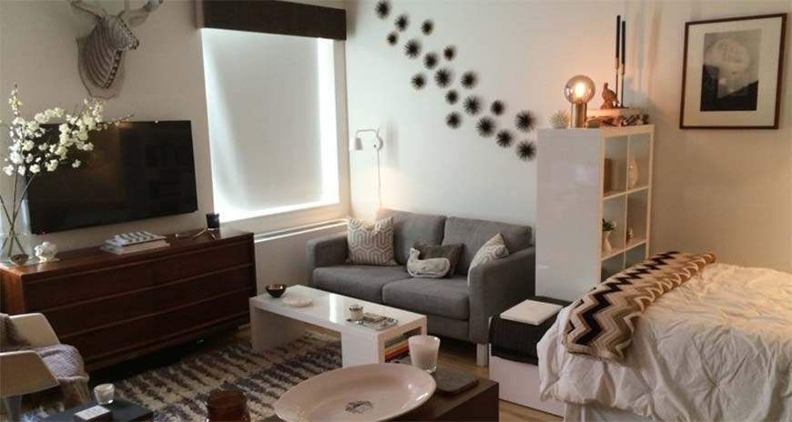 В квартире-студии очень уместно разделение помещения мебелью или аксессуарами. Красиво смотрится большой аквариум, который можно поставить между гостиной и спальней. Уместными будут легкие светлые ширмы, изящные этажерки, на которых можно поставить оригинальные вещицы. При этом нужно помнить, что много декоративных вещей в маленьком помещении сделают его захламленным.
