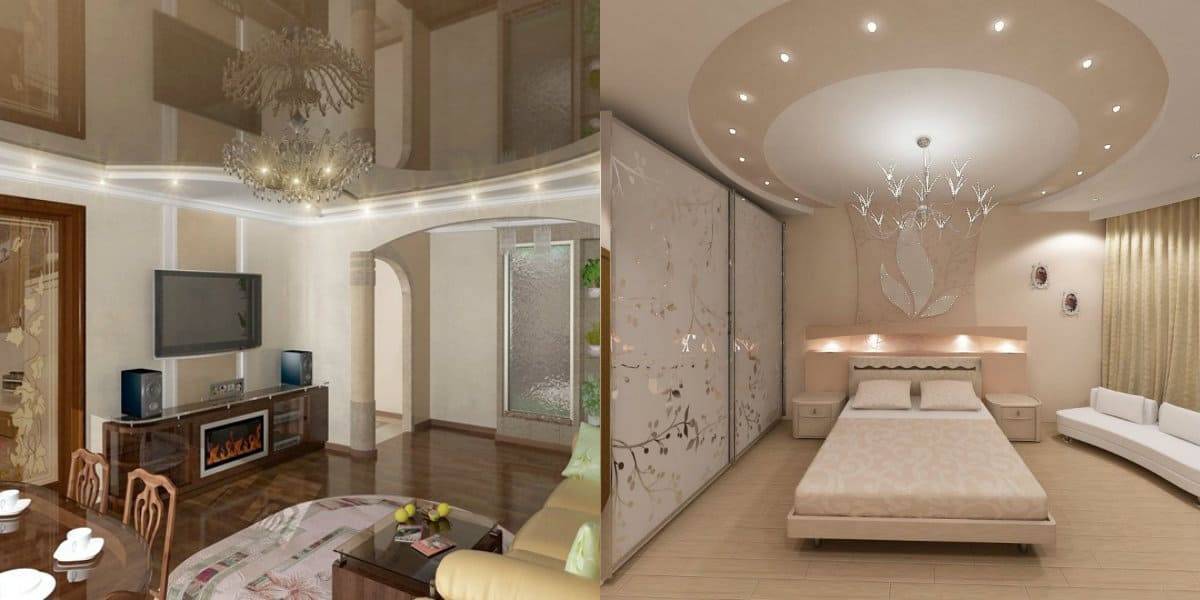 В любом случае, зал — это достаточно просторная комната с комфортной мебелью и условиями для отдыха разного вида, а значит, что и оформление потолочной поверхности должно учитывать: