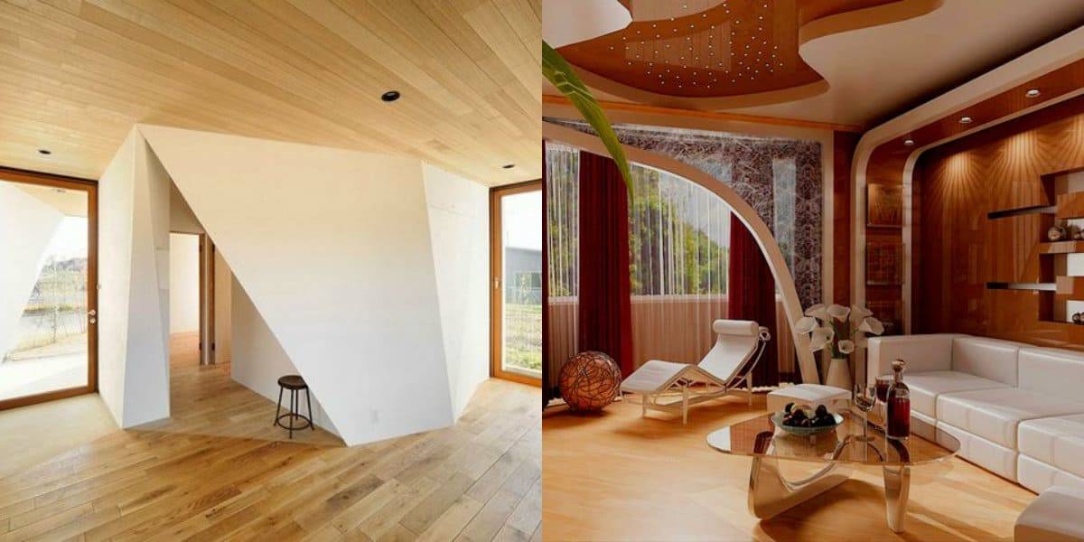 Чаще всего гостиная – самая большая комната в доме, так что где еще экспериментировать с формами, как не здесь. Особенно интересно смотрятся потолки с вогнутыми и выпуклыми элементами.