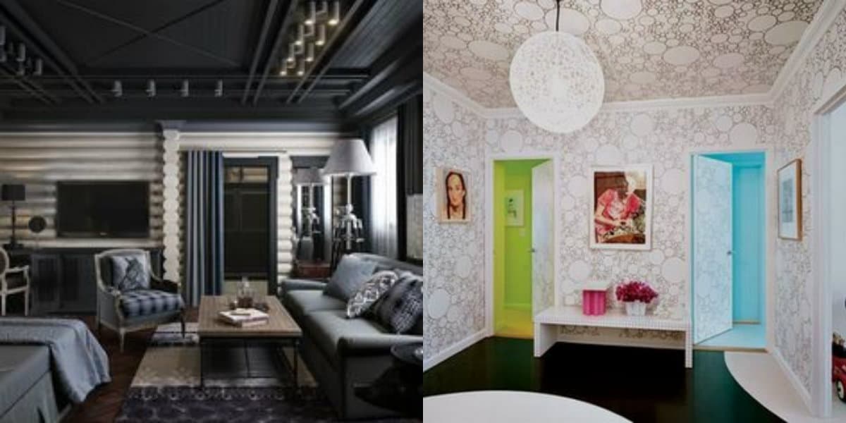 - белый и черный — универсальные цвета из базовой палитры для потолка, которые прекрасно сочетаются с любыми оттенками — однако стоит ограничивать их использование в интерьере разумным балансом с другими цветами: сочетание белых стен и аналогично выбеленного потолка может привести к «больничному» эффекту, а полярное взаимодействие черных стеновых поверхностей с таким же черным потолком станет причиной создания мрачного и давящего на психику психоделического интерьера — о какой уж тут семейной гармонии может идти речь?