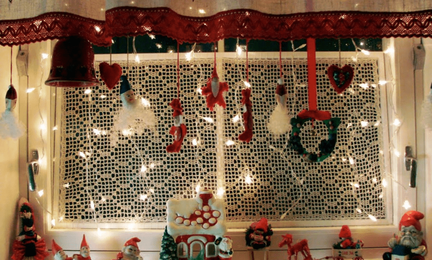 Наиболее простой вариант украсить шторы – купить и повесить на всю ширину оконного проема вертикальную гирлянду. Но по такому же принципу можно нанизать на нити фигурки из фетра, снежинки, веточки ели и сосны. В последнем случае комната дополнительно наполнится хвойным ароматом.