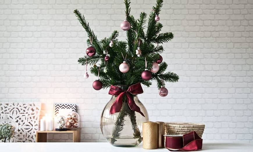 - Несколько хвойных веточек ставят с стеклянный прозрачный сосуд, а рядом устанавливают макет дома из мелованного картона.