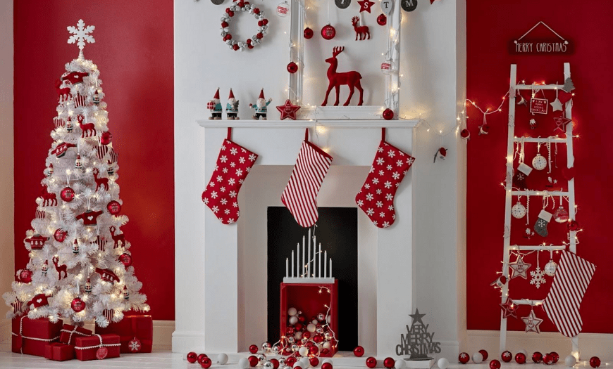 Классический новогодний декор оформляют в красно-зелёной цветовой гамме.