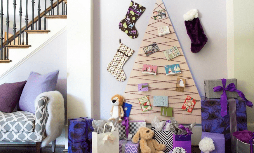 - Разноразмерные палочки набивают на стену, которые имитируют новогоднее деревце.