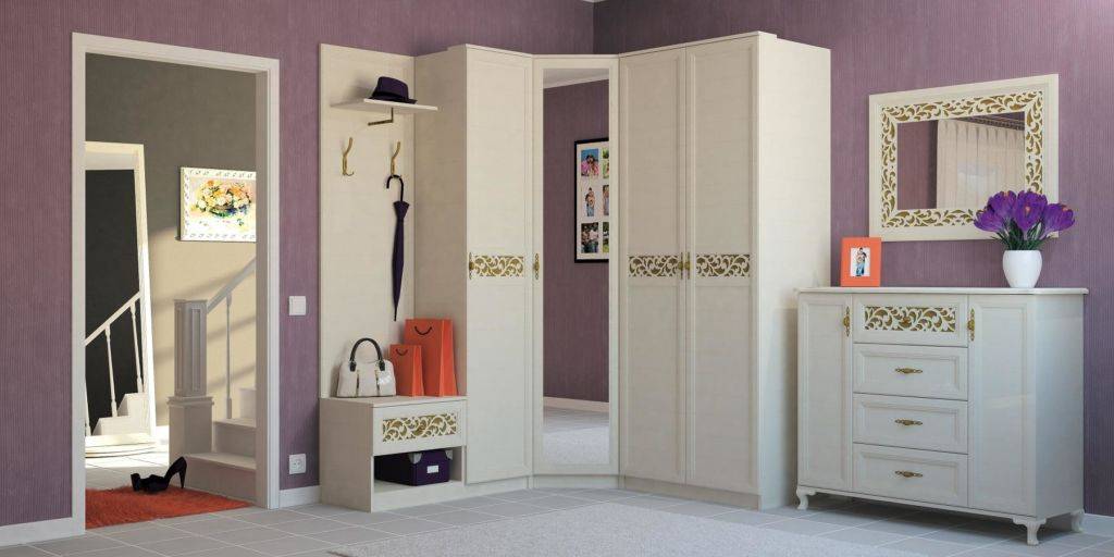 Такое обустройство мебели подойдет для помещения небольшого размера. В этом случае выбирается угловой шкаф. С его помощью заполняют участок, который обычно остается незадействованным. С одной стороны от углового шкафа ставят узкий шкаф с большим количеством полочек, а с другой вешается зеркало.