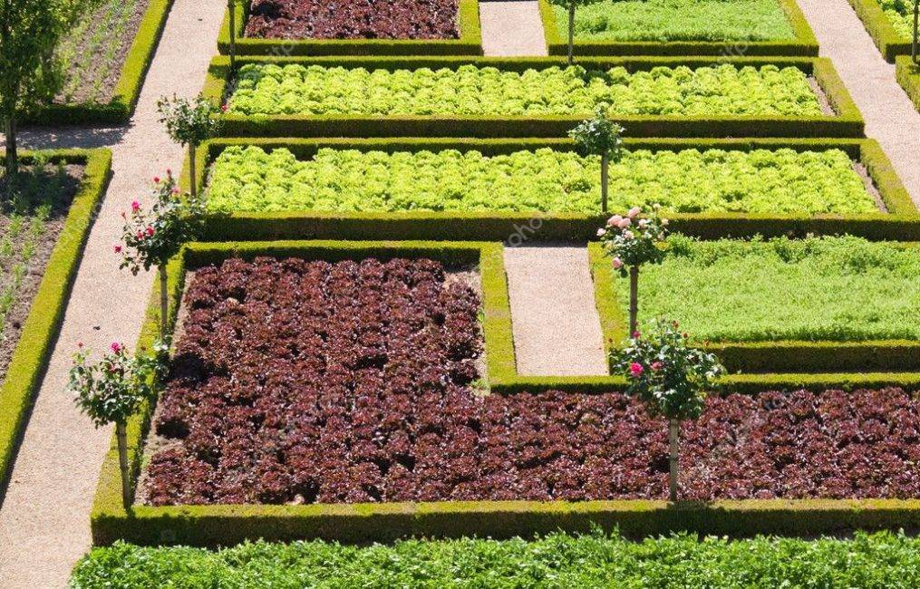 Как правило, для удобства ухода за культурами французские грядки располагают на определенной высоте. Желательно (но не обязательно) высаживать растения также симметрично. К примеру, по краю всех грядок располагается редис, в центре – салат, а с другого края – краснокочанная капуста.