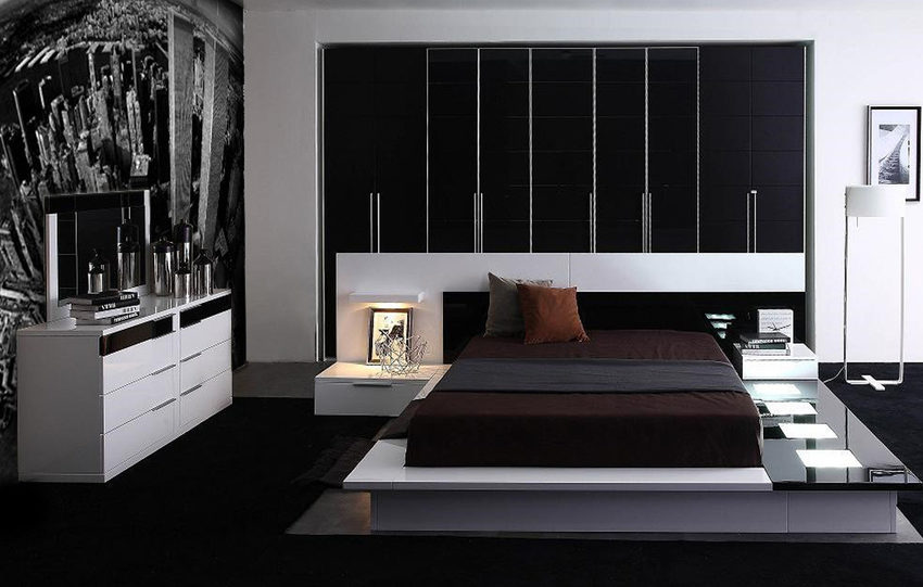 Хай-тек для спальни предполагает выбор кровати-трансформера, квадратных прикроватных тумбочек, навесных полок, сделанных из пластика или металла.