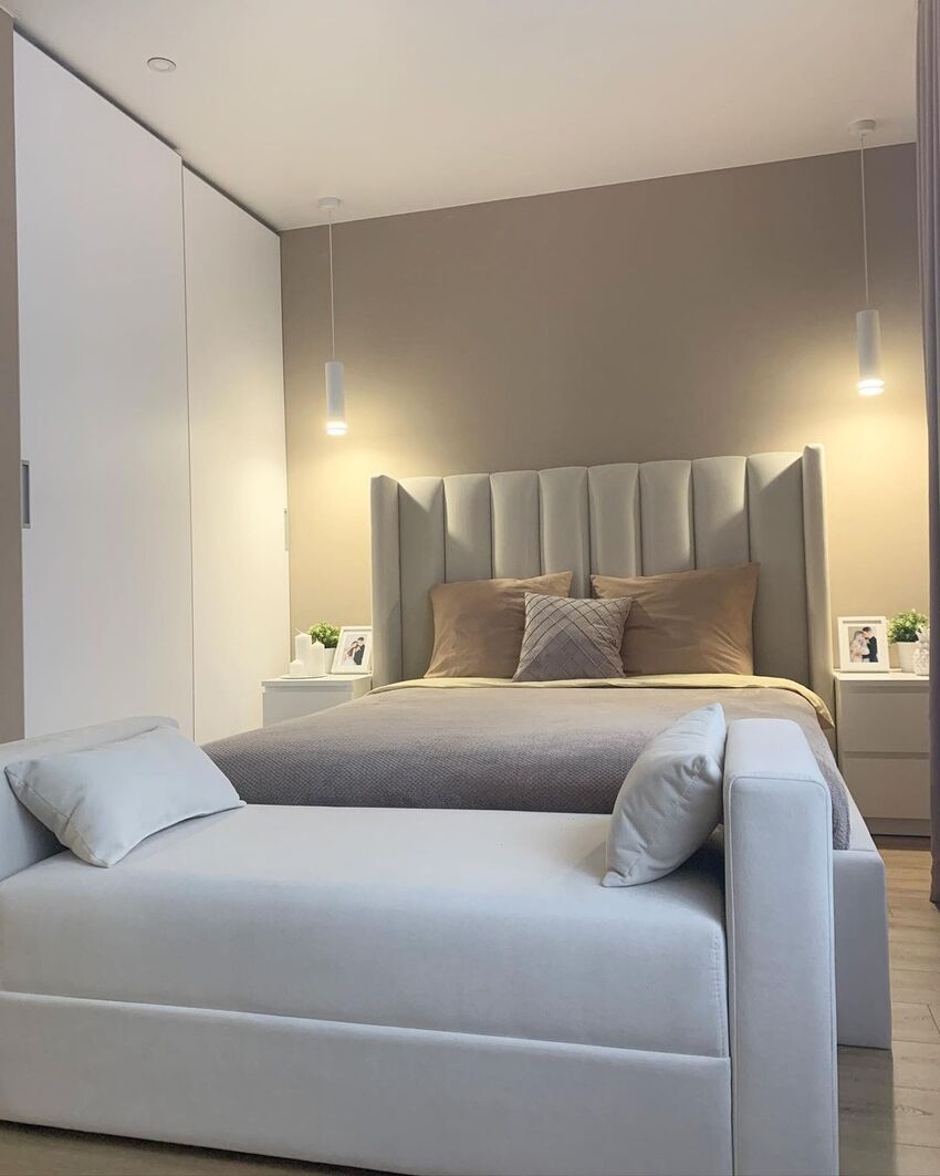 Акценты: нужно грамотно продумать способ размещения мебели возле кровати с учетом всех параметров, чтобы достигнуть максимальной гармоничности и легкости композиции.